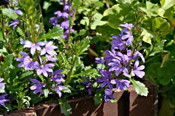 Scaevola aemula. Den fås i blå, blomsterfarver og er velegnet både i krukker, ampler