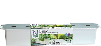 Startpakke til hydroponisk dyrkning. Hvid kasse med blåt låg til 6 planter + 6 forsåede briketter (3 x salat, 3 x basilikum) + brikettekurve + 250 ml specialnæring. Kasse af PS og ABS, kurve af PP. Fremstillet i Sverige. 795 x 160 x 150 mm.
