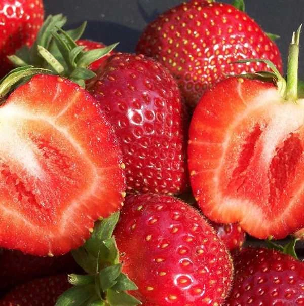 Sen jordbærsort. Store mørkerøde blanke bær, mild syrlig smag.