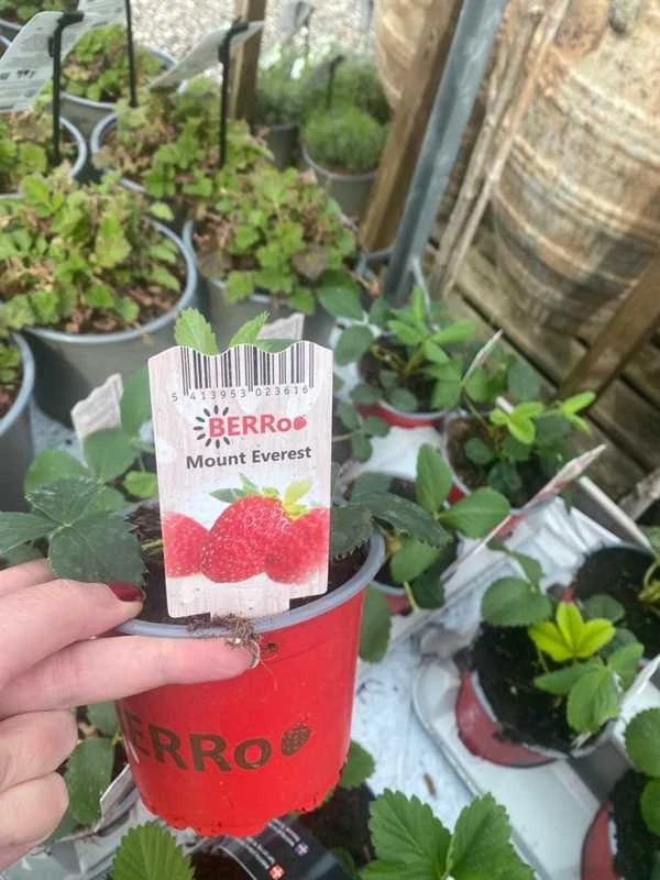 Jordbærplanten ‘Mount Everest’ bliver op til 1,50 cm høj og ca 1 meter bred, kan bindes op eller hænge.