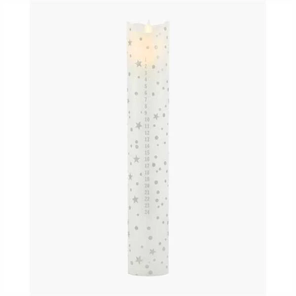 Et fint elektrisk kalenderlys med små julestjerner og julekugler i farven sølv på ydersiden af kalenderlyset, udstyret med en fjernbetjening der gør det muligt at vælge hvilken af de 24 dage, der skal lyse op. Kun til indendørs brug.